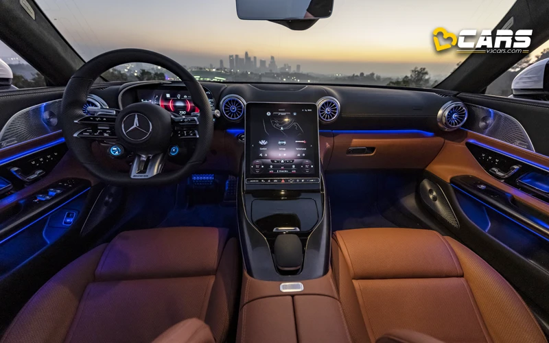 On the inside, the biggest detail of the SL 55 is its power-adjustable 11.9-inch touchscreen infotainment system. The vertically-oriented touchscreen system offers tilt adjustment to reduce unwanted reflections when driving with the roof open. Furthermore, the SL 55 offers a 12.3-inch digital instrument cluster, an AMG steering wheel with configurable rotary dials and AMG sports seats.